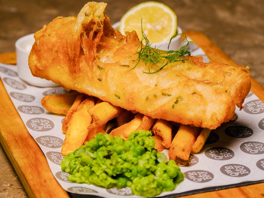 Beginnen Sie Ihr Wochenende auf die richtige Art und Weise mit einem echten britischen Klassiker – Fisch & Chips, genauso, wie Sie es mögen. Sie haben die Wahl zwischen Kabeljau oder Schellfisch, alles goldbraun gebraten und mit krossen Pommes frites und viel Erbsenpüree serviert.