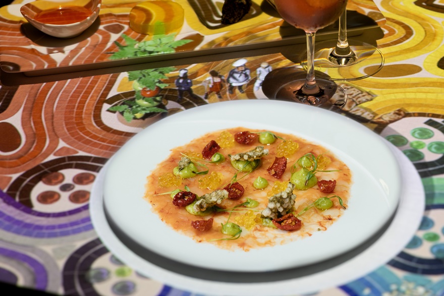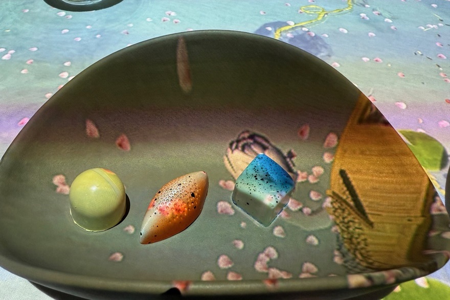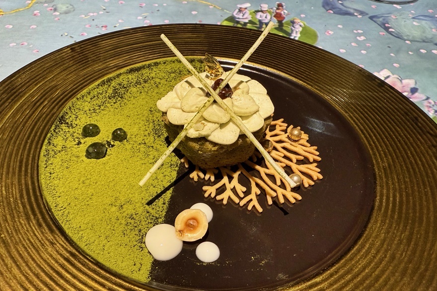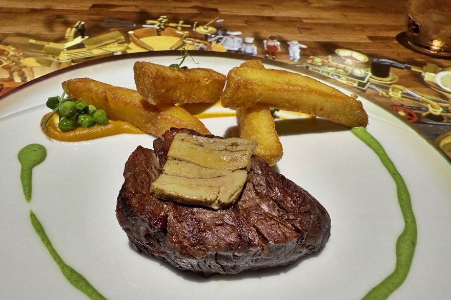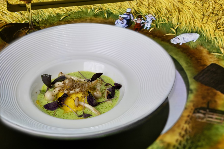 Das sorgfältig zusammengestellte Menü beginnt mit den Aromen Spaniens in Form von einem CARPACCIO DE CARABINEROS. Die kulinarische Reise geht weiter in Italien mit RAVIOLI RIPIENI DI BURRATA CREMOSA. Der Hauptgang, zubereitet vom Le Petit Chef selbst, können sich die Gäste elegante TOURNEDOS ROSSINI mit Béarnaise-Sauce, Kürbispüree, Pommes frites und Pfefferkruste schmecken lassen. Die Reise endet in Japan mit MATCHA KEKI CHOKORETO – einem Matcha-Kuchen mit weißer Schokolade, Blattgold, gerösteten Haselnüssen und Vanille. Anschließend werden noch farbige Pralinen serviert.