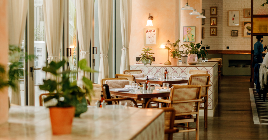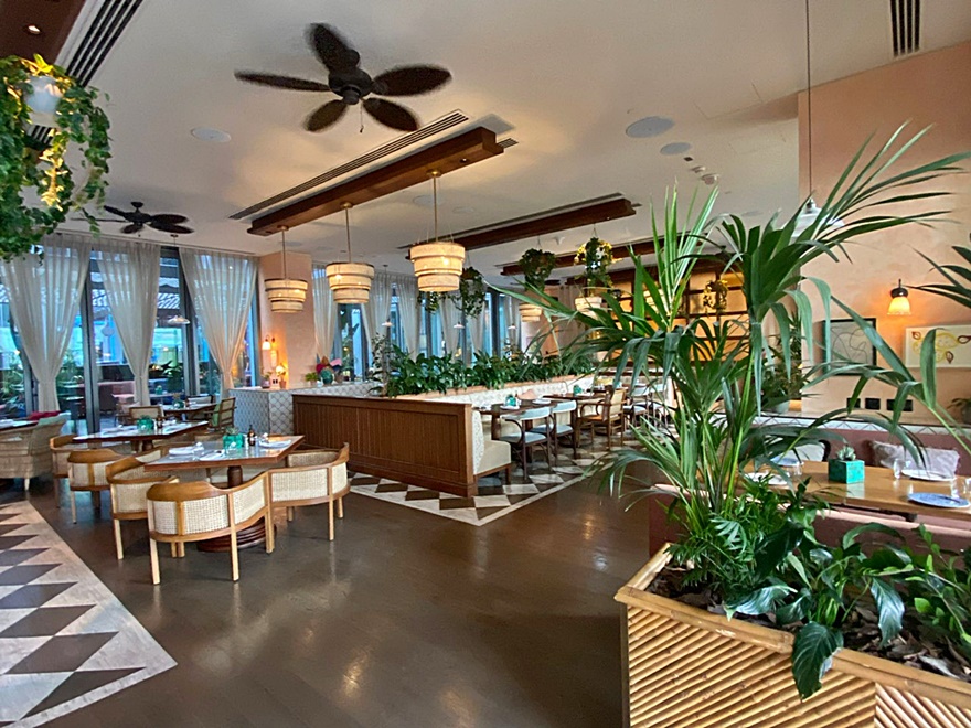 Die Innenräume des geräumigen Restaurants sind mit tropischen Grün- und Rosatönen ausgekleidet und von beiden Seiten fällt Tageslicht herein.