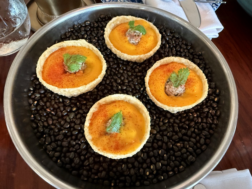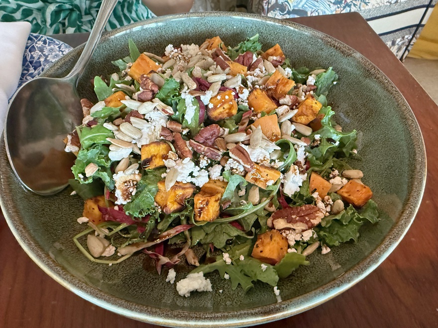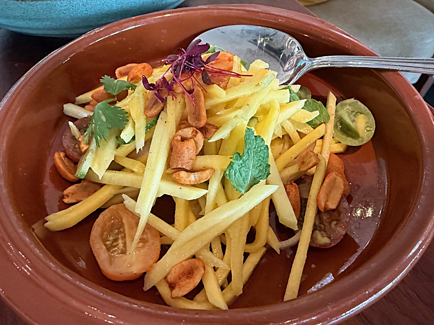 Wir starteten mit Truffle Mushroom Puri – einem berühmten Streetfood aus Kalkutta – sehr schmackhaft mit Trüffel und Knoblauch, gefolgt von meinem Favoriten – dem Spicy Mango Salad, mit Erdnüssen, Ingwer und Chilli sowie einem sehr schmackhaften Roasted Sweet Potato Salad mit Senfdressing, Pekan-Nüssen und Balsamico.