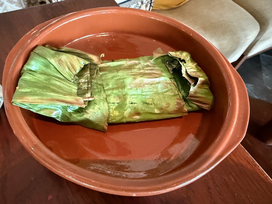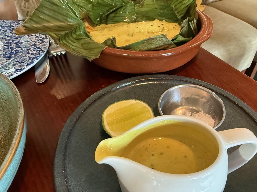 Beide Gerichte waren sehr gut zubereitet und gewürzt. Der Seabass war in ein Bananenblatt gewickelt und wurde dann mit einer traumhaften Kokos-Curry-Lemongrass-Sauce übergossen – einfach super lecker.