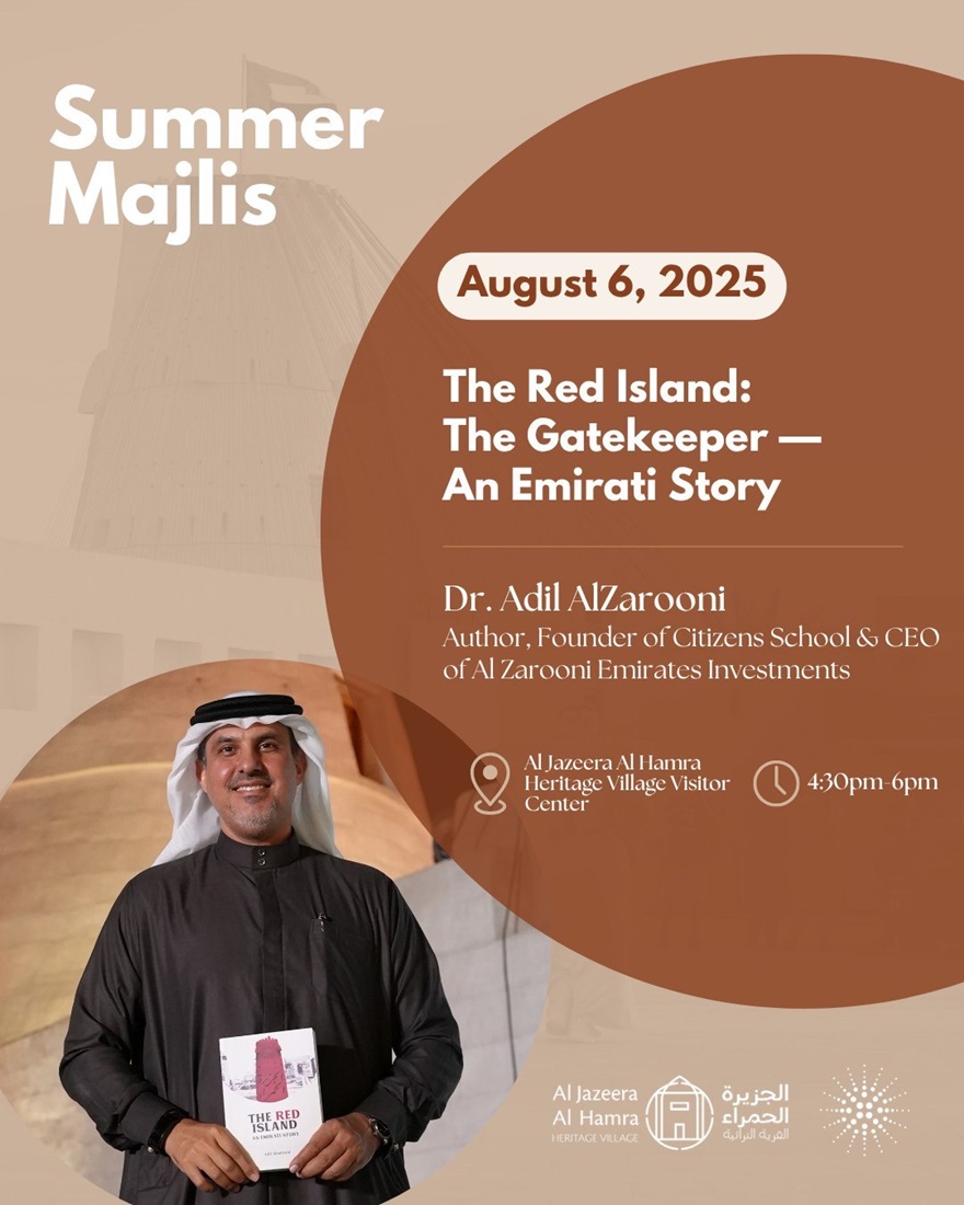 Die Serie Sommer-Majlis in Al Jazeerah geht weiter mit der nächsten Ausgabe –  unter der Leitung von Dr. Adil AlZarooni, der seinen neuesten Roman „The Red Island – The Gatekeeper – An Emirati Story” vorstellen wird – im Visitor Center vom Al Jazeera Al Hamra Heritage Village.