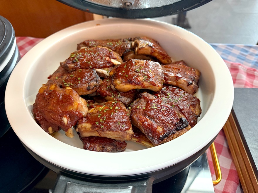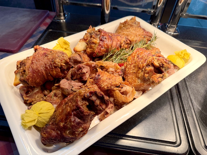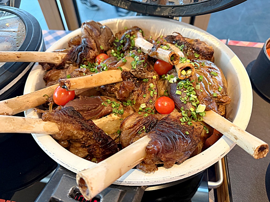 An warmen Gerichten gab es knusprige Schweinshaxen, Schweinebauchwürfel, deutsche Würste, Ribs, Knödel, Blaukraut, Sauerkraut und einiges mehr sowie gegrillten Lachs, Rinderbraten, vegane Würste, Lammhaxen etc.