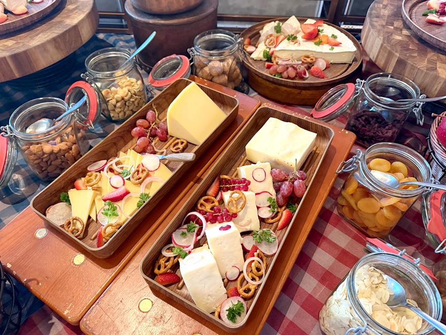 Im hinteren Bereich des gemütlichen Restaurants befand sich ein großer Grazing-Table mit den unterschiedlichsten Vorspeisen, wie Räucherfisch, Lachs, Thunfischsalat, anderen Salaten, Wurstwaren, Saucen und Dips sowie mit einer großen Käseauswahl incl. Obatzdn sowie Tomaten, Nüsse und Früchte.