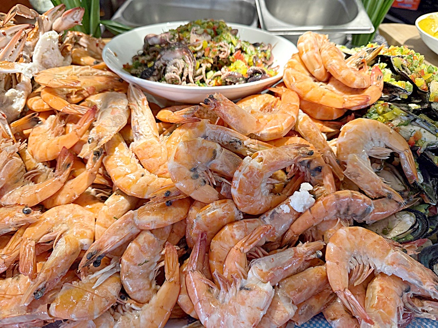 Im Restaurant waren wie bei jedem Brunch verschiedene Buffets aufgebaut wie z.B. eine Seafood-Theke mit gekochten Krabben, Muscheln, omanischen Sand-Lobstern, Shrimps, Austern etc. mit diversen Saucen.