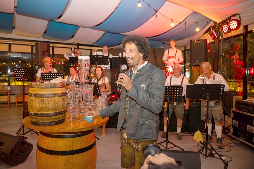 Vor der Bühne im klimatisierten ERNST-Biergarten war das Fass mit Paulaner Oktoberfestbier aufgebaut und Flo Akinbiyi begrüßte in typisch bayrischer Tracht charmant die Gäste zum diesjährigen Oktoberfest bevor er sehr gekonnt mit drei Schlägen das Fass anstach.