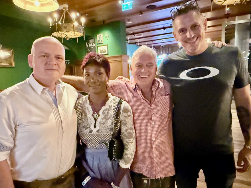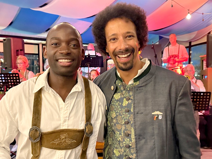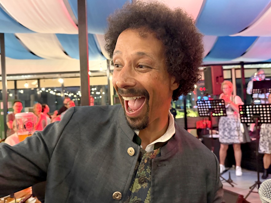 Bis 19 Uhr waren fast alle Gäste eingetroffen – sehr international – aber auch aus der deutschsprachigen Community waren doch einige gekommen – unter anderem Flo Akinbiyi, ein international tätiger Moderator, Keynote-Speaker und Kommunikationscoach – und ein echter Münchner.