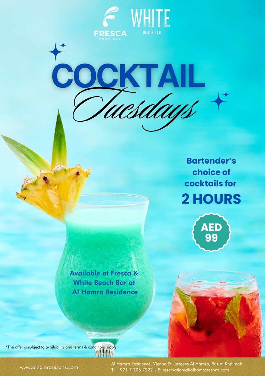 Die Dienstage sind jetzt viel cooler mit farbenfrohen Cocktails. Chillen Sie diesen Sommer an den Pools oder am Strand und genießen Sie anschließend 2 Stunden lang Bartender’s Choice Cocktails an der Fresca und White Beach Bar – für nur 99 AED!