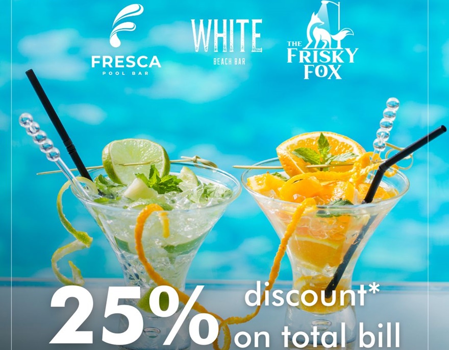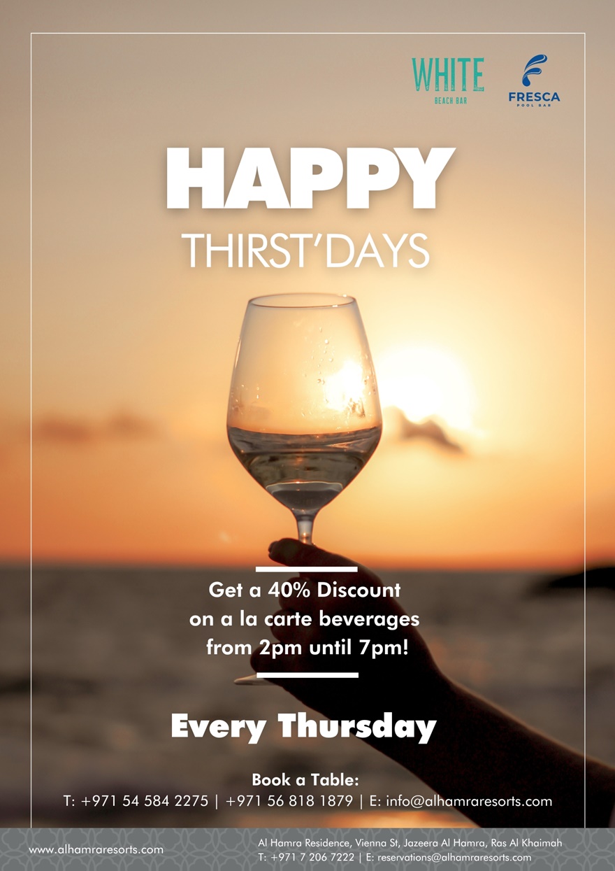 Machen Sie Ihren Aufenthalt im Sommer  in der Al Hamra Residence zu etwas ganz Besonderem, denn Sie erhalten jetzt bis zu 25 % Discount auf Speisen und Getränke in den vier Bars und Restaurants Social Kitchen, Fresca, White Beach Bar und The Frisky Fox.