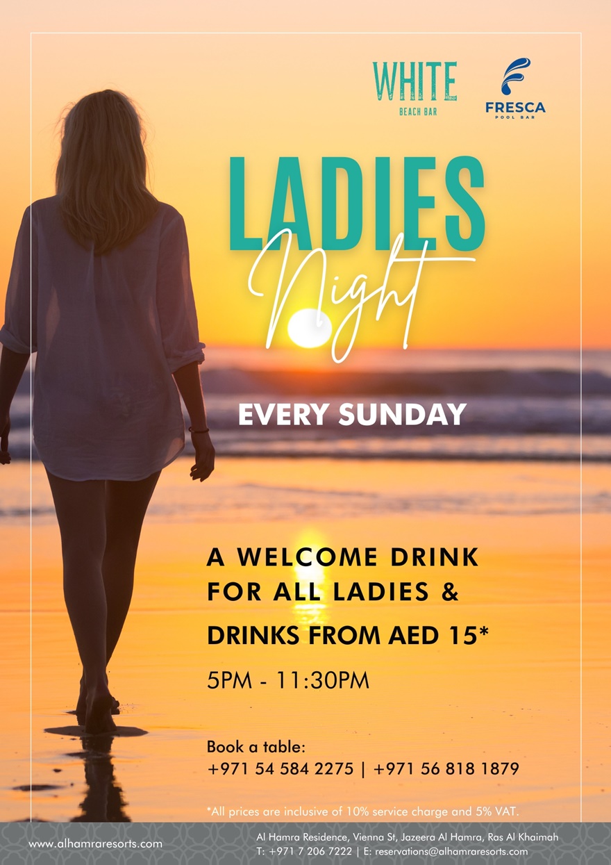 Jeden Sonntag ist Ladies Night! Alle Damen erhalten einen Willkommensdrink bei der Ankunft und einen Sonderpreis ab 15 AED für Getränke.