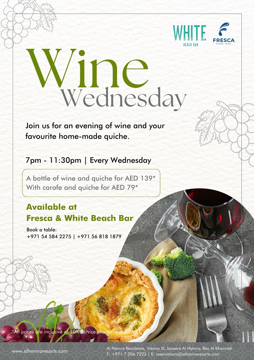 Genießen Sie mittwochs einen Abend mit Wein und Ihrer Lieblings-Quiche in der Fresca Pool Bar! Eine Flasche Wein und  dazu eine Quiche für AED 139 AED – mit einer Karaffe Wein und der Quiche für  AED 79.