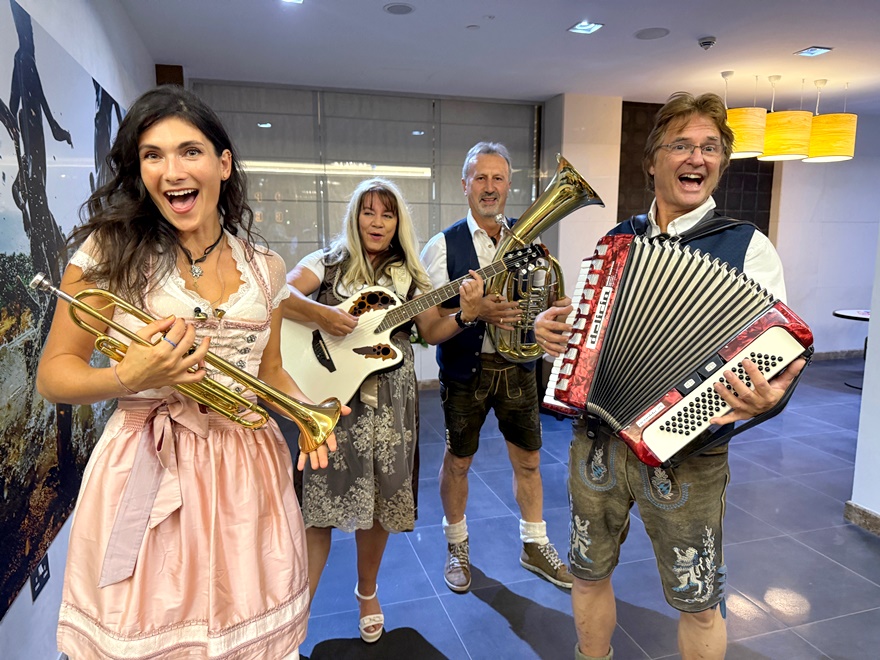 Nachdem die Band – als erste Martina mit der Trompete, gefolgt von Gunther am Akkordeon, Bandleaderin Sylvie an der Gitarre und Chris mit einer Bass-Tuba einmarschiert war, spielten die vier Musiker zuerst ein bayrisches Set mit bekannten Liedern.