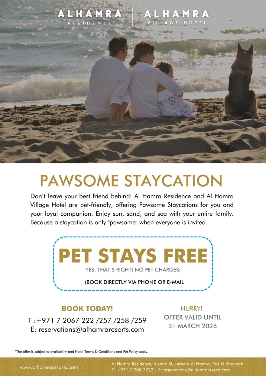 Lassen Sie Ihren besten Freund nicht zu Hause! Die Al Hamra Residence und das Al Hamra Village Hotel sind tierfreundlich und bieten „Pawsome Staycations“ für Sie  und Ihre treuen Begleiter. Genießen Sie Sonne, Sand und Meer mit Ihrer ganzen Familie.
