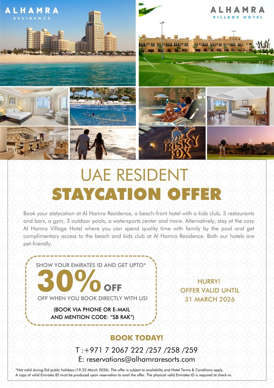 Bis Ende März gibt es in den Al Hamra Hotels – Al Hamra Residence und Al Hamra Village Hotel – interessante Staycation-Angebote für Residents.